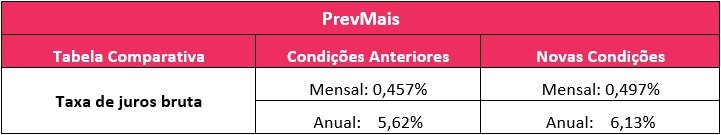 O Plano PrevMais sofreu um leve aumento em sua taxa de juros. No entanto, é válido ressaltar que as condições de empréstimo permanecem atrativas, conforme demonstrado abaixo.