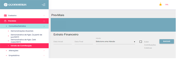 Para conferir seu extrato, acesse o autoatendimento, clique em “PrevMais” no menu esquerdo, selecione “Consultas/Extratos” e, por fim, clique em “Extrato de Contribuição”. Preencha a tela de acordo com o período desejado e clique em “Baixar”: