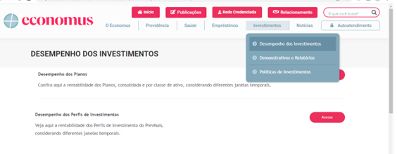 Para o acompanhamento do desempenho das cotas do seu perfil de investimento acesse a divulgação mensal, no menu inicial, clique em “Investimentos”, em seguida “Desempenho dos Investimentos”, na sequência “Desempenho dos Perfis de Investimentos” e escolha o seu perfil.