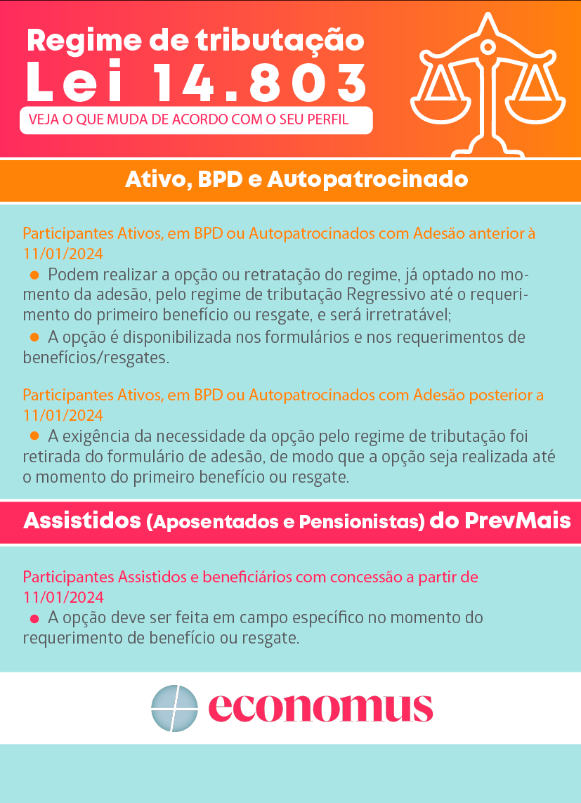 A principal modificação está relacionada ao regime de tributação. Agora, os participantes de planos de benefícios de caráter previdenciário, estruturados nas modalidades de contribuição definida ou contribuição variável, terão a possibilidade de exercer novamente a escolha pelo regime de tributação.