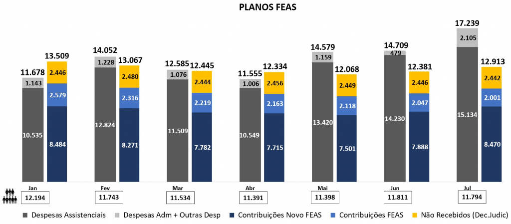 Após a implementação do reajuste no percentual de contribuição para 15,95%, ocorrido em janeiro/21, observou-se que, caso houvesse a arrecadação das mensalidades de todos os beneficiários conforme definido no estudo atuarial, os planos Feas teriam apresentado equilíbrio financeiro nos primeiros meses de 2021. No entanto, a partir de março/21, apesar das ações de melhoria de eficiência adotadas para promover redução nas despesas assistenciais, o novo agravamento da pandemia e a grande evasão de beneficiários fizeram com que as despesas superassem as contribuições arrecadadas, conforme demonstrado no gráfico a seguir, e impactaram os resultados dos planos.