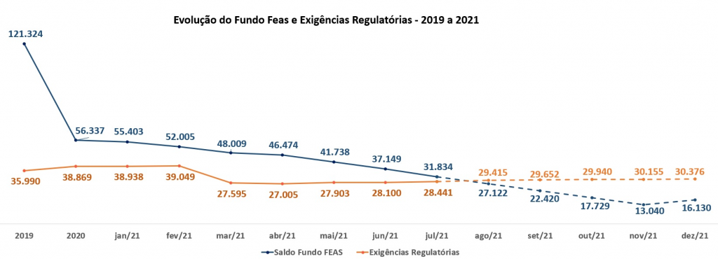 No cenário de ausência de solução para o custeio das contribuições dos beneficiários que não contribuem por decisão judicial e de forte impacto da evasão de beneficiários pagantes, os planos Feas precisaram consumir recursos do Fundo FEAS, de modo que as projeções atualizadas indicaram a necessidade de revisão do custeio a partir do mês de agosto/21, sob risco de comprometimento do montante mínimo de recursos para garantia da operação dos planos Feas, calculadas em R$29,4 milhões, conforme demonstrado no gráfico abaixo: