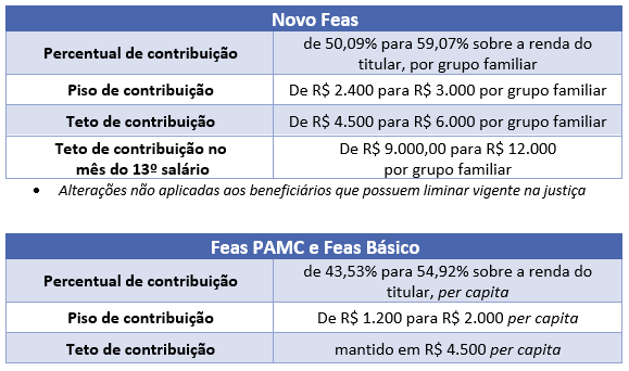 Como já noticiado, os planos Feas possuem modelo de custeio que não propicia a sustentabilidade econômico-financeira, em razão de ter as contribuições baseadas nos rendimentos dos titulares e ter sofrido impactos do esgotamento dos recursos do Fundo FEAS e da redução do número de beneficiários inscritos. As decisões judiciais que impedem a revisão dos percentuais de contribuição de grande parte dos beneficiários do Novo Feas e ainda o encerramento desse plano, também são fatores que contribuem para o desequilíbrio, na medida em que limita a arrecadação mensal.