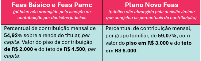 Com a decisão, os percentuais de contribuição e valores de piso e teto dos planos vinculados ao Fundo FEAS seguem conforme a tabela abaixo: