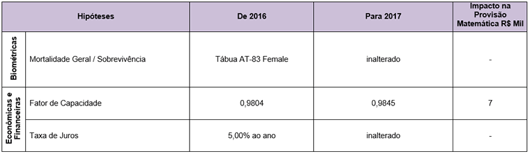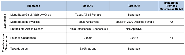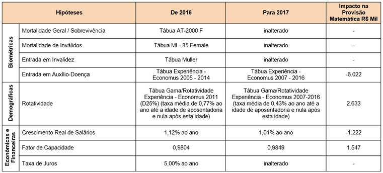 Confira na tabela abaixo, o resumo das hipóteses atuariais de 2016 e 2017: