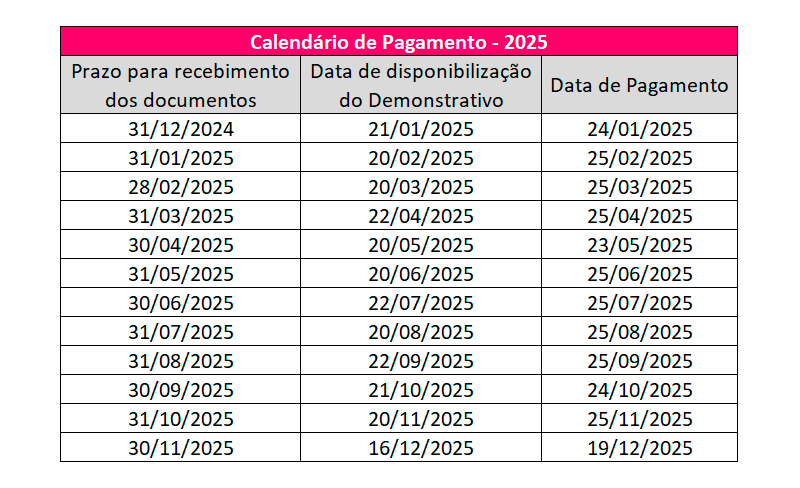 Nota: Para que a manutenção e concessão sejam realizadas na data de pagamento acima, é necessário que a documentação seja recebida por completo na data estipulada neste cronograma.